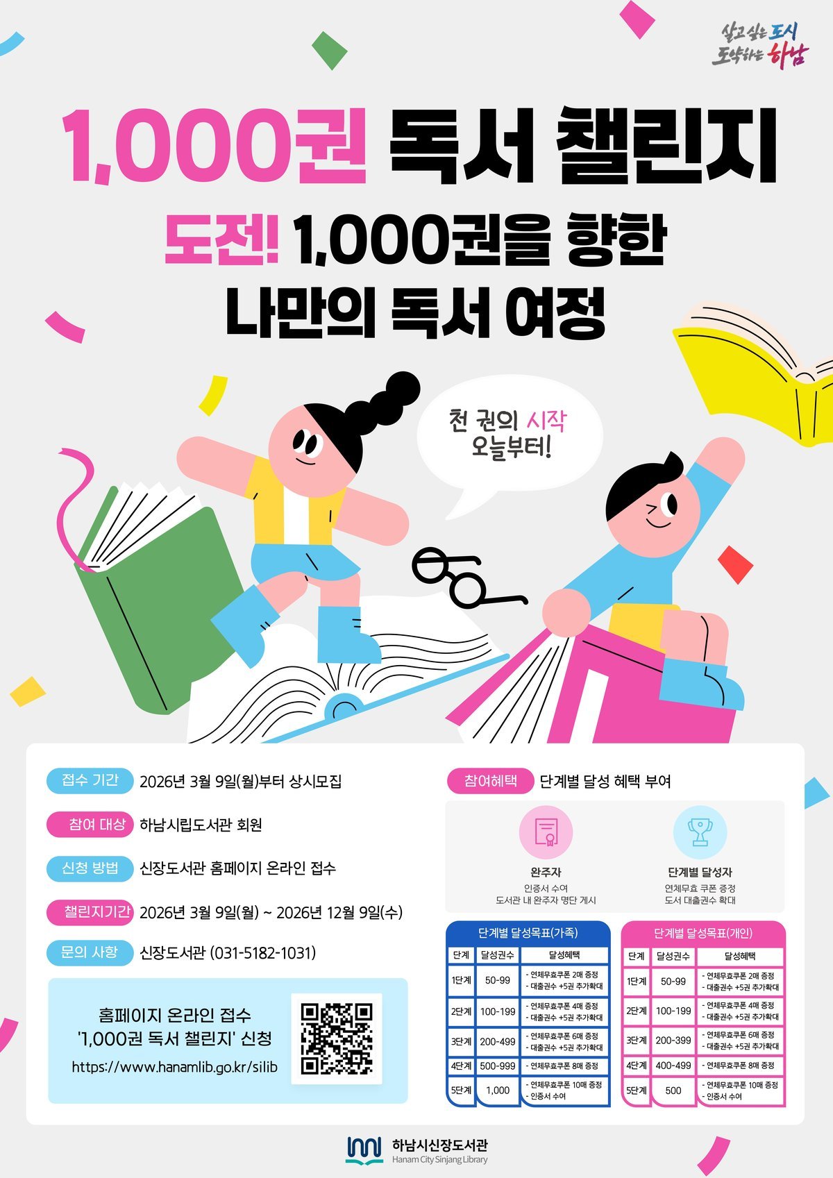 [금요저널] 하남시신장도서관은 시민의 지속적인 독서 참여와 생활 속 읽기 습관 정착을 위해 오는 3월 9일부터 '1000권 독서 챌린지'를 운영한다.