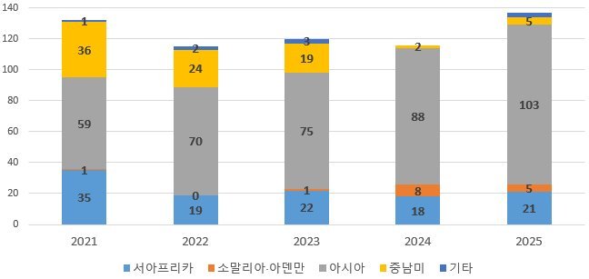 해적사건 중 선박 피랍의 경우, 2025년 상반기에 소말리아·아덴만 해역과 서아프리카 해역에서 각각 3건과 1건이 발생하였다. 특히, 소말리아·아덴만 해역에서 발생한 선박 피랍으로 승선자 26명이 일시적인 억류를 당한 것으로 확인되었다.