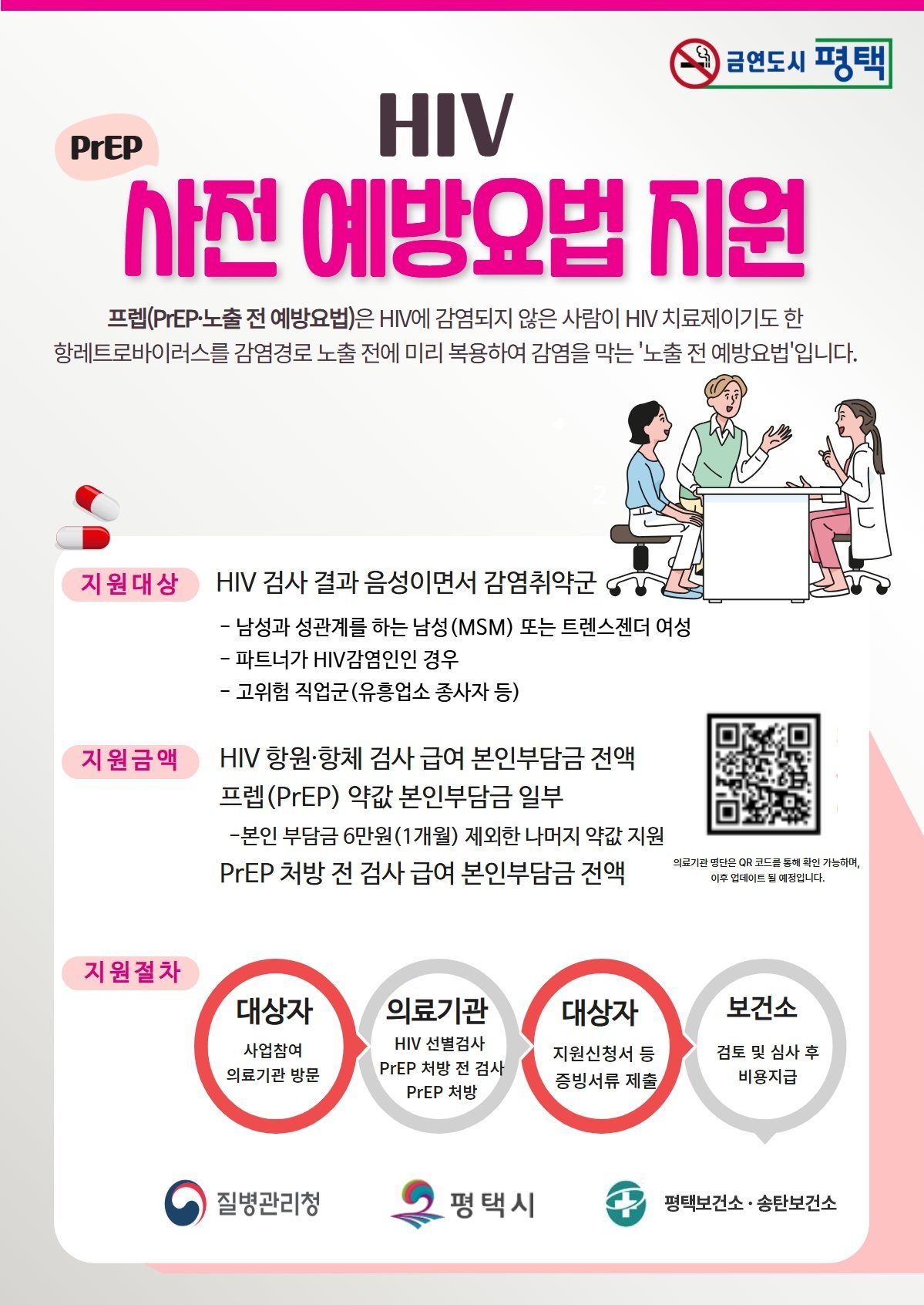 PrEP 지원사업은 전국 17개 시도에서 2025년 1월부터 시행 중이며 지원 대상 기준 및 신청 절차 등 세부 사항은 평택·송탄보건소 누리집에서 확인할 수 있다.