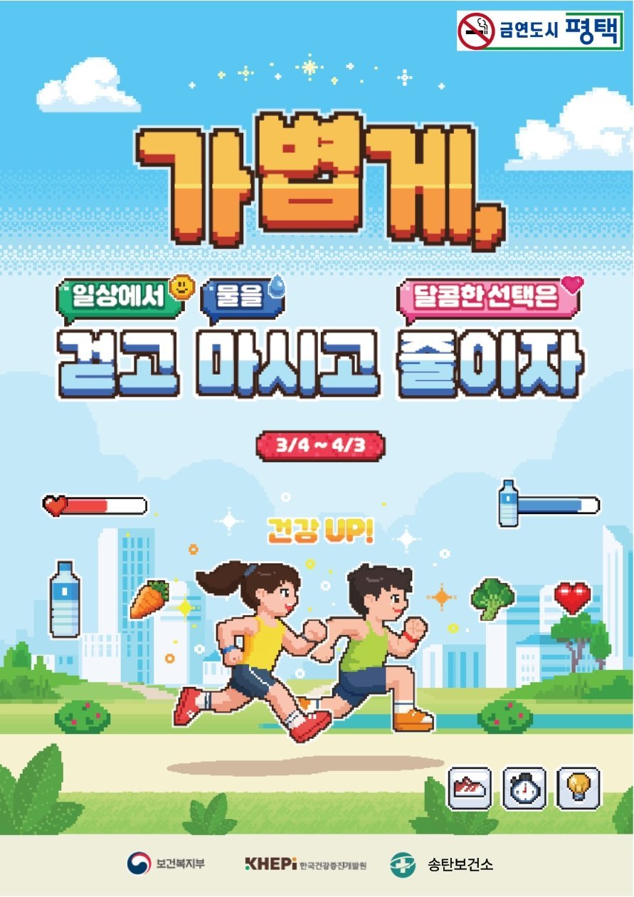 송탄보건소는 비만 예방 핵심 메시지로 ‘가볍게 걷고 물을 마시고 나트륨·당·지방을 줄이자’를 집중 홍보하며 4월 4일 시민건강걷기대회 현장에서도 홍보부스를 운영할 예정이다.
