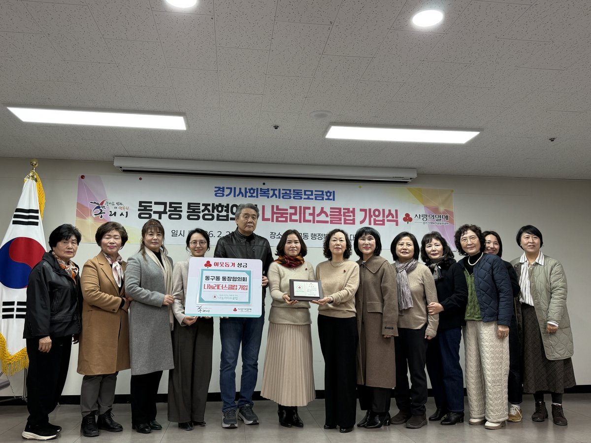 [금요저널] 구리시 동구동 통장협의회는 지난 25일 동구동 행정복지센터에서 경기사회복지공동모금회 관계자가 참석한 가운데 사랑의 열매 '나눔리더스클럽'에 가입하고 인증패를 전달받아 구리시 제3호 나눔리더스클럽이 됐다.