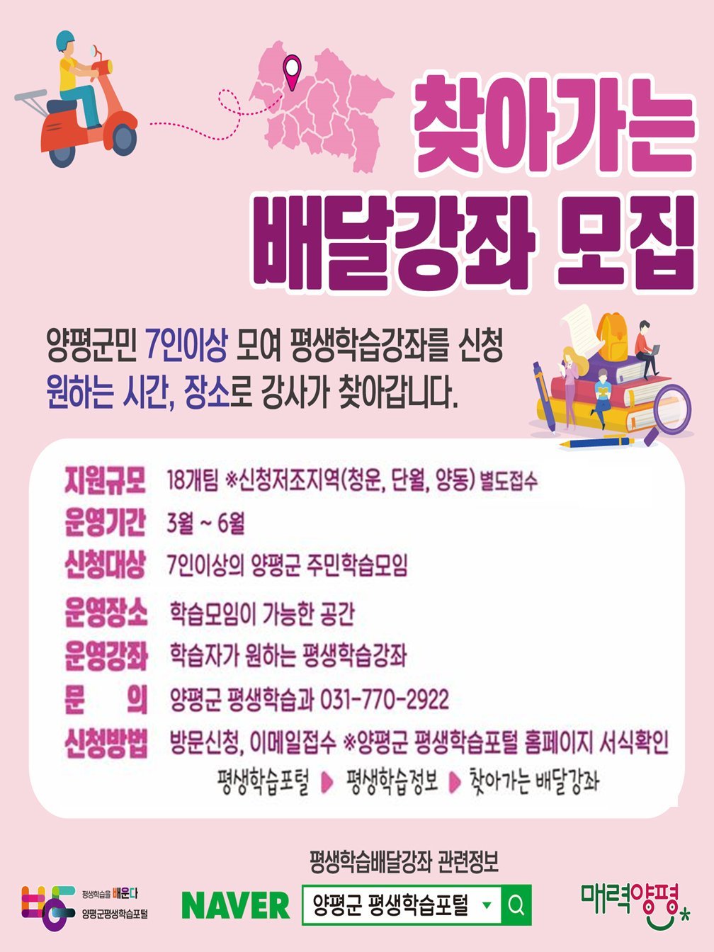 [금요저널] 양평군은 지난 2월 20일까지 ‘2026년 상반기 찾아가는 배달강좌’평생학습 학습모임을 모집한 결과, 총 29개 팀을 심사해 20개 팀을 최종 선정했다고 밝혔다.