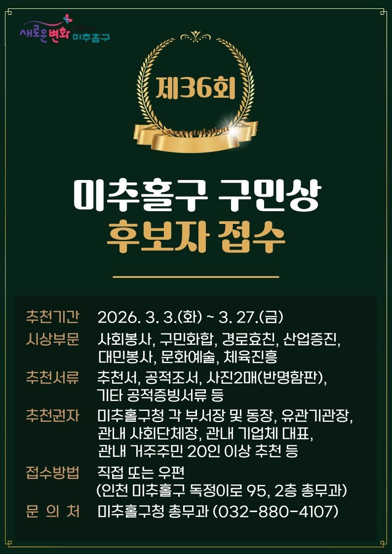 [금요저널] 인천 미추홀구는 오는 5월 1일 ‘제36회 구민의 날’을 맞아 지역사회 발전에 헌신한 모범 구민을 발굴하기 위해 오는 3월 3일부터 27일까지 ‘미추홀구 구민상’및 ‘명예 구민증’대상자를 추천받는다.