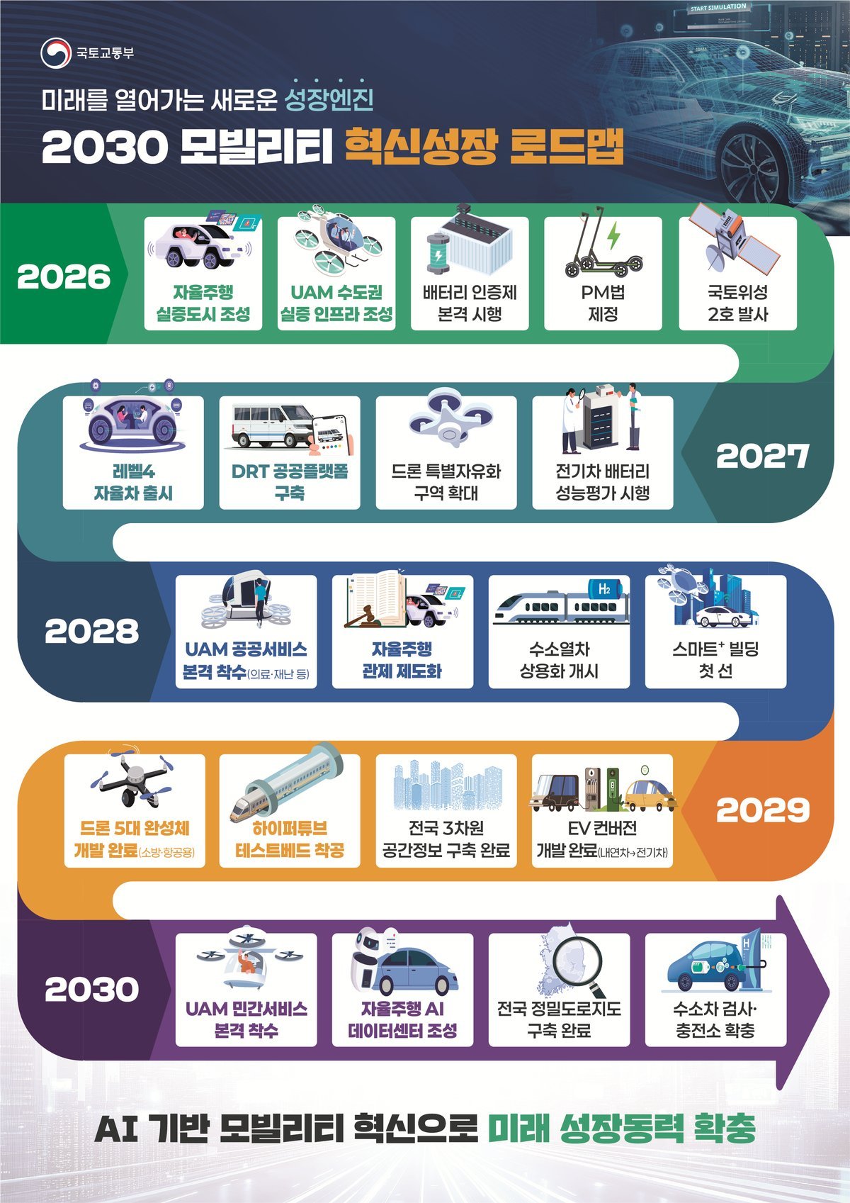 이번 로드맵은 ‘미래 모빌리티와 K-AI 시티 실현’ 등 이번 정부의 주요 국정과제 및 ’26~’30년 국토부 업무계획의 상세 추진계획을 담은 것으로,