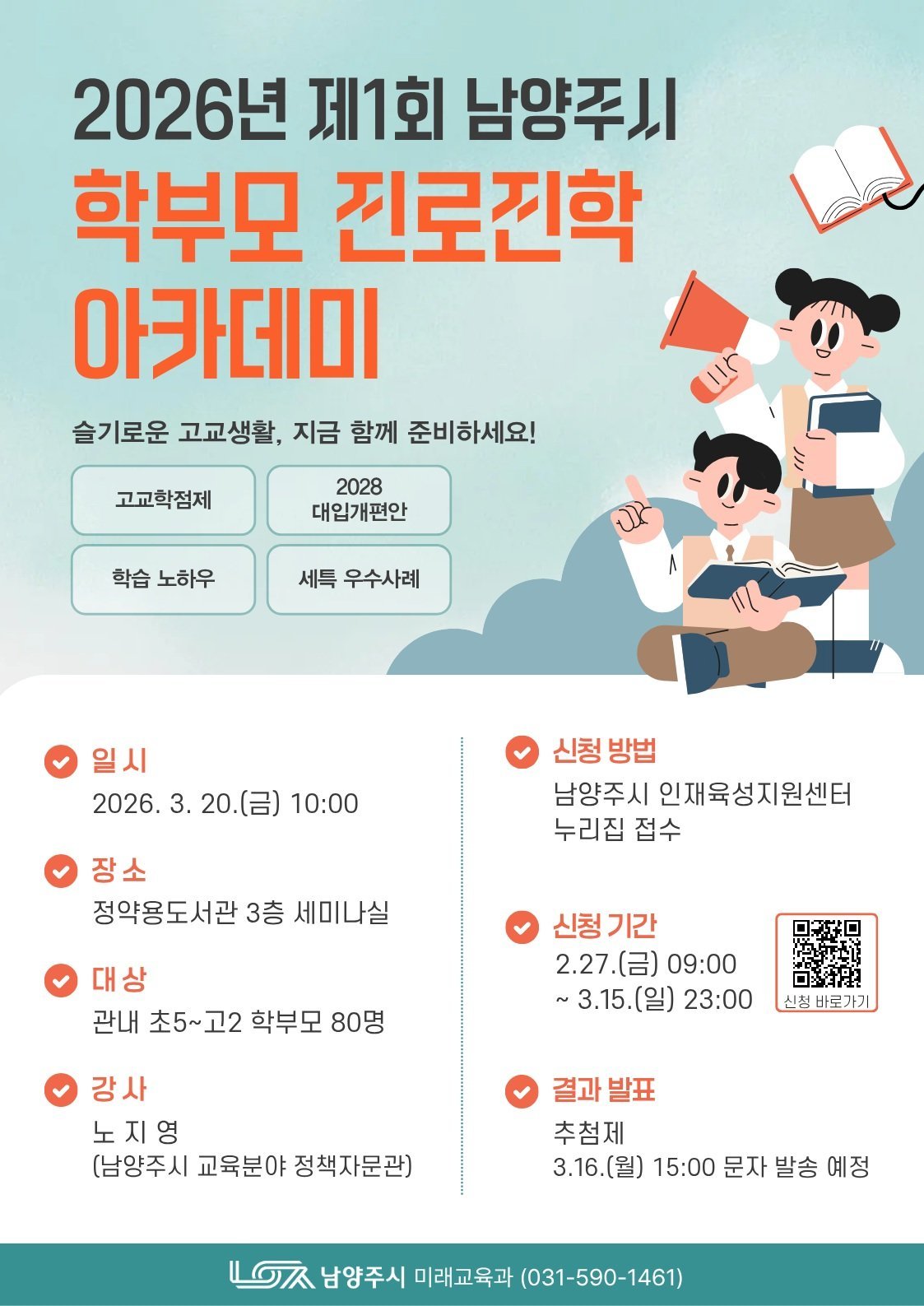 [금요저널] 남양주시는 오는 27일부터 정약용도서관에서 열리는 ‘2026년 제1회 학부모 진로진학 아카데미’참가자를 모집한다고 밝혔다.