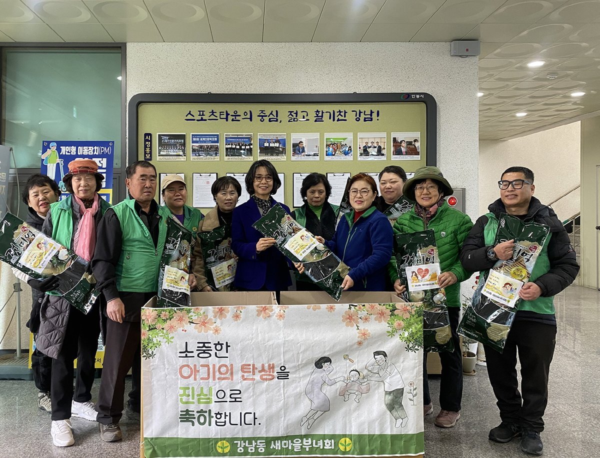 정진영 강남동장은 출산 축하를 위한 미역 지원으로 출산 친화적 분위기 조성에 힘써주시고 나눔을 실천해 주시는 강남동새마을부녀회원 여러분께 깊은 감사의 말씀을 드린다 며 앞으로도 출산 친화적 환경 조성을 위한 다양한 시책 발굴에 최선을 다하겠다 고 전했다.