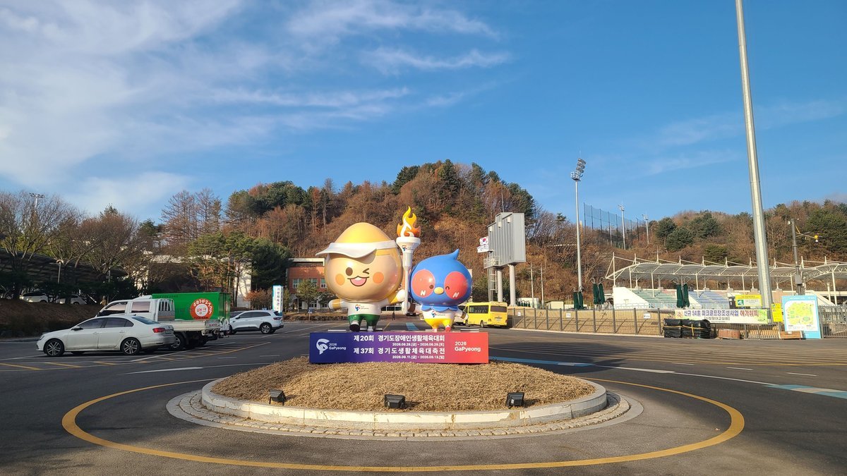성화를 들고 달리는 형상의 마스코트 조형물은 가로 3m, 세로 2.8m 규모의 섬유강화플라스틱 소재로 제작됐으며 태양열 조명이 설치돼 야간에도 높은 시인성을 확보하고 있다.