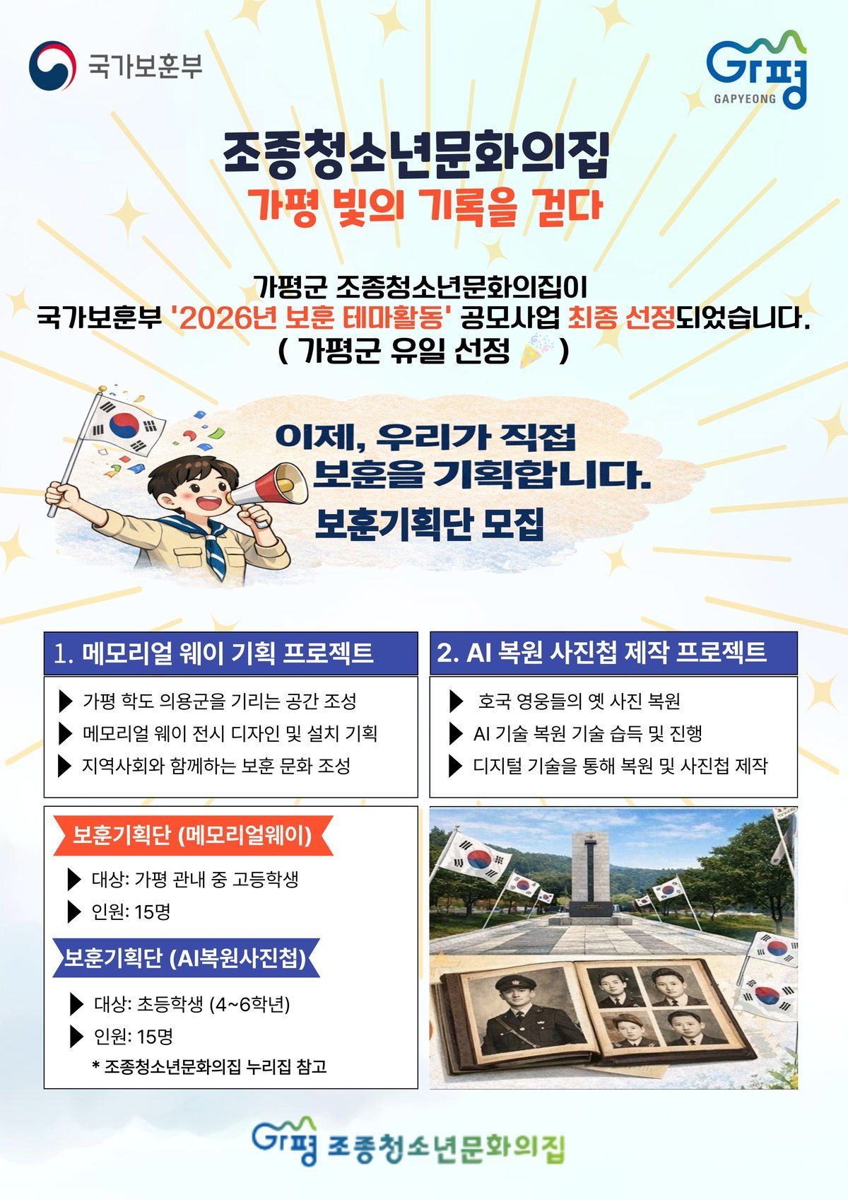 [금요저널] 가평군 조종청소년문화의집이 국가보훈부가 주최한 '2026년 보훈 테마활동'공모사업에 최종 선정됐다.