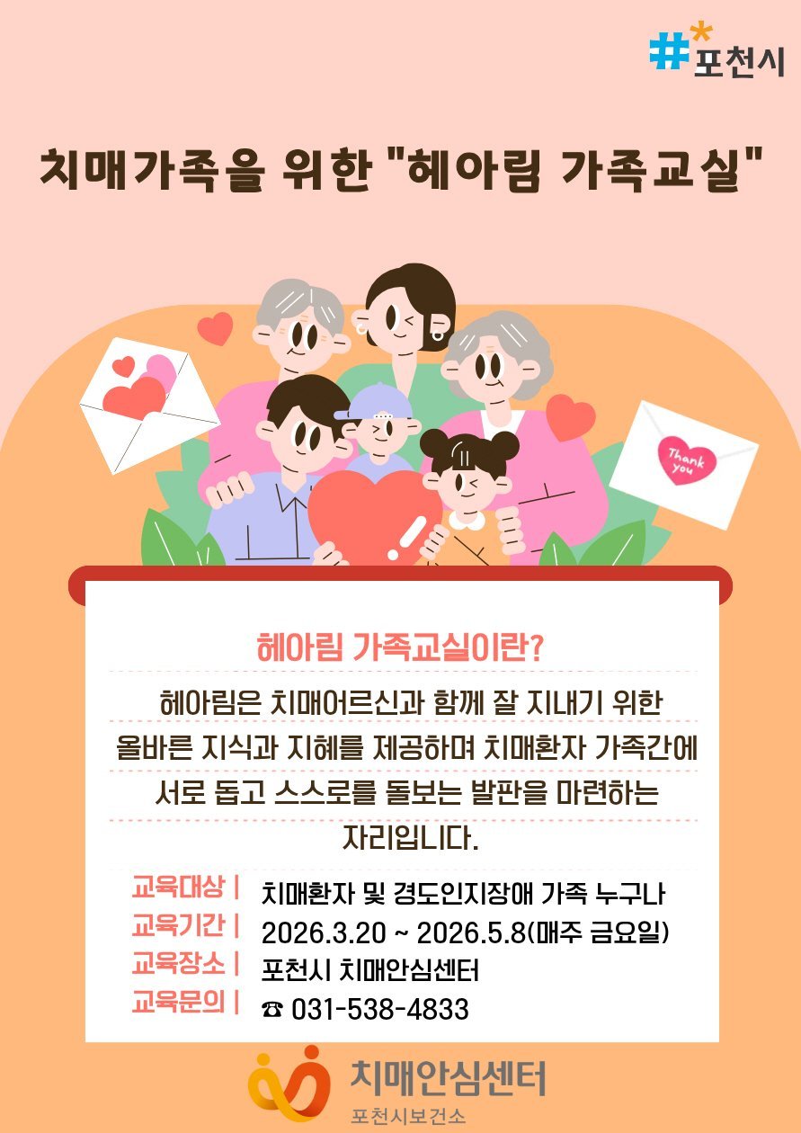 [금요저널] 포천시 치매안심센터는 오는 3월 20일부터 치매환자 가족을 대상으로 상반기 ‘헤아림’가족교실 프로그램을 운영하고 참여자를 모집한다.