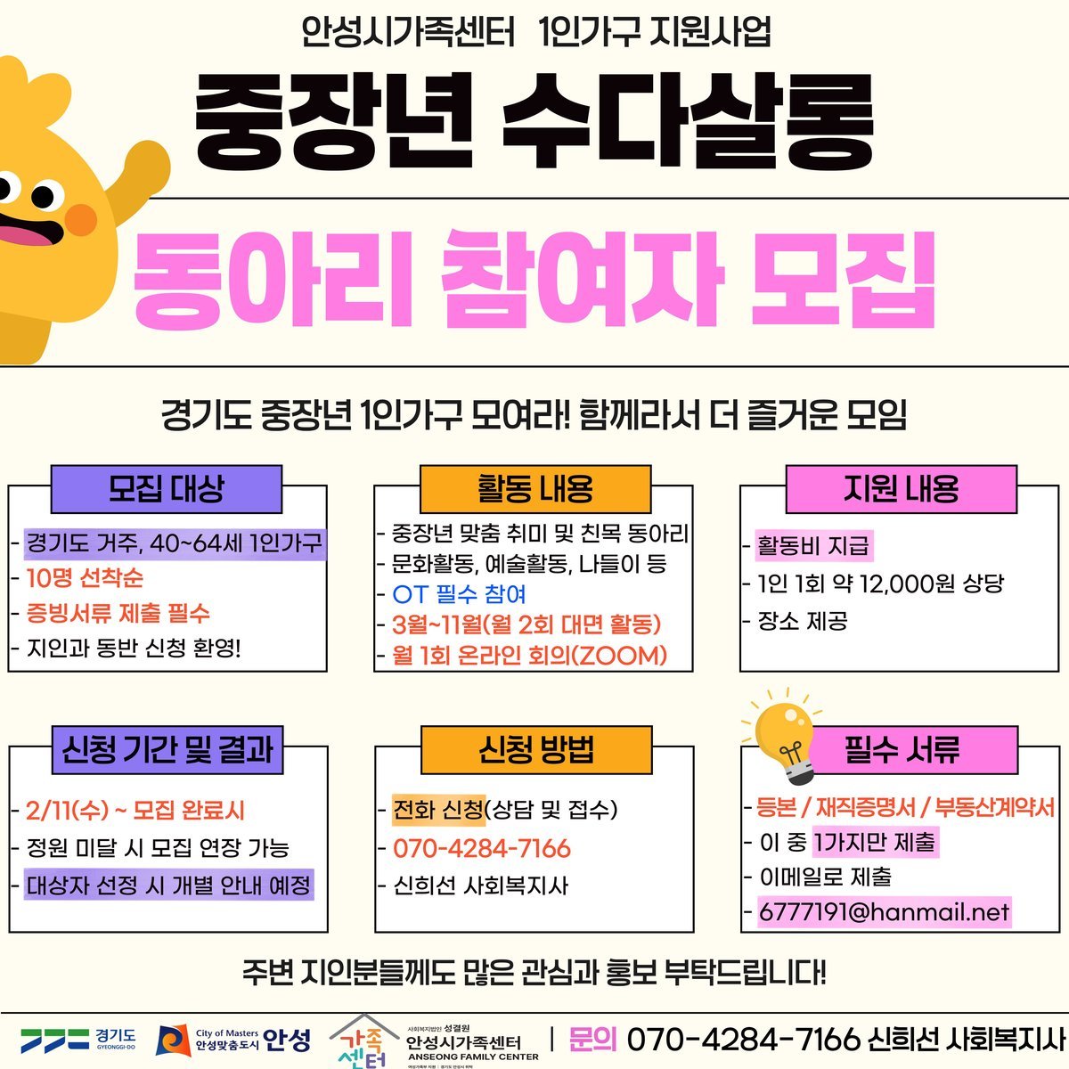 자세한 사항은 안성시 가족센터 1인가구 지원사업담당 사회복지사에게 문의하면 된다.