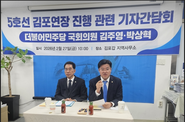 더불어민주당 김주영(김포갑)·박상혁(박상혁) 의원은 27일 김포갑 지역사무소에서 기자간담회를 열고 서울 5호선 김포 연장 추진 경과와 예타 대응 상황을 설명한 뒤 “조만간 좋은 결과가 나올 것으로 기대한다”고 입을 모았다.