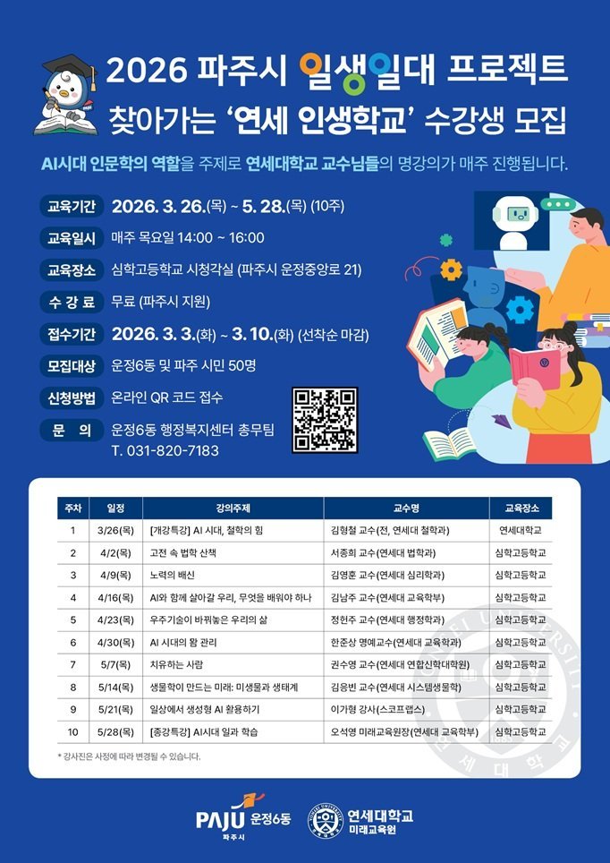 김현욱 운정6동장은 “명문 사학인 연세대학교, 지역 인재 양성의 요람인 심학고등학교와 함께 일생일대 프로젝트를 진행하게 되어 뜻깊다”며 “운정6동 주민들이 멀리 나가지 않고도 집 앞에서 최고 수준의 강의를 들으며 배움의 기쁨을 누릴 수 있도록 행정적 지원을 아끼지 않겠다”고 말했다.