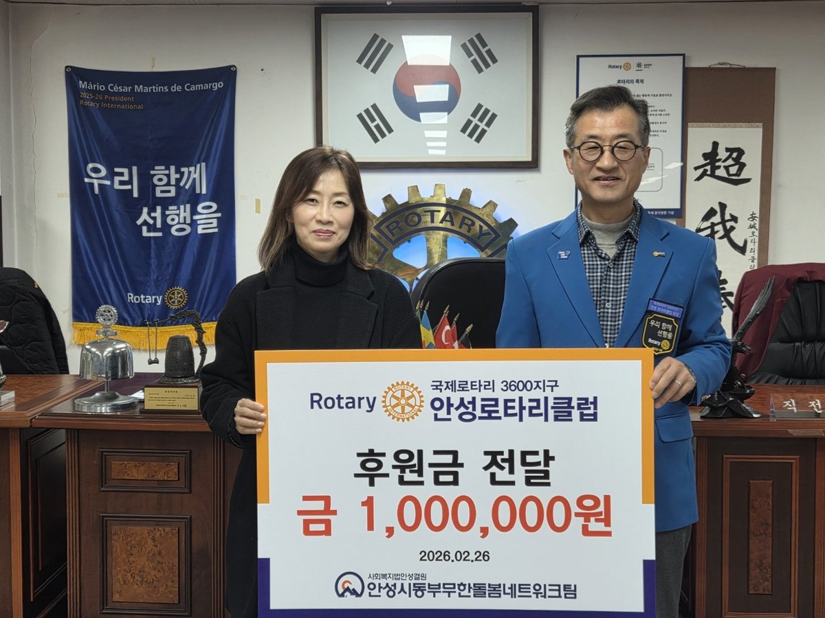 [금요저널] 안성시동부무한돌봄네트워크팀은 지난 26일 국제로타리 3600지구 안성로타리클럽으로부터 촘촘한 복지 안전망 구축을 위한 후원금 100만원을 전달받았다.