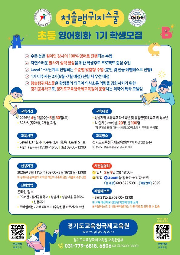 [금요저널] 지역격차 해소를 위한 온라인 기초영어 프로그램 운영 말하기 중심 단계별 영어회화 프로그램 운영 외국어 학습 기회 확대를 위한 제2외국어 프로그램 운영 경기도교육청국제교육원이 외국어 특화 공유학교 '청솔랭귀지스쿨'을 운영한다.