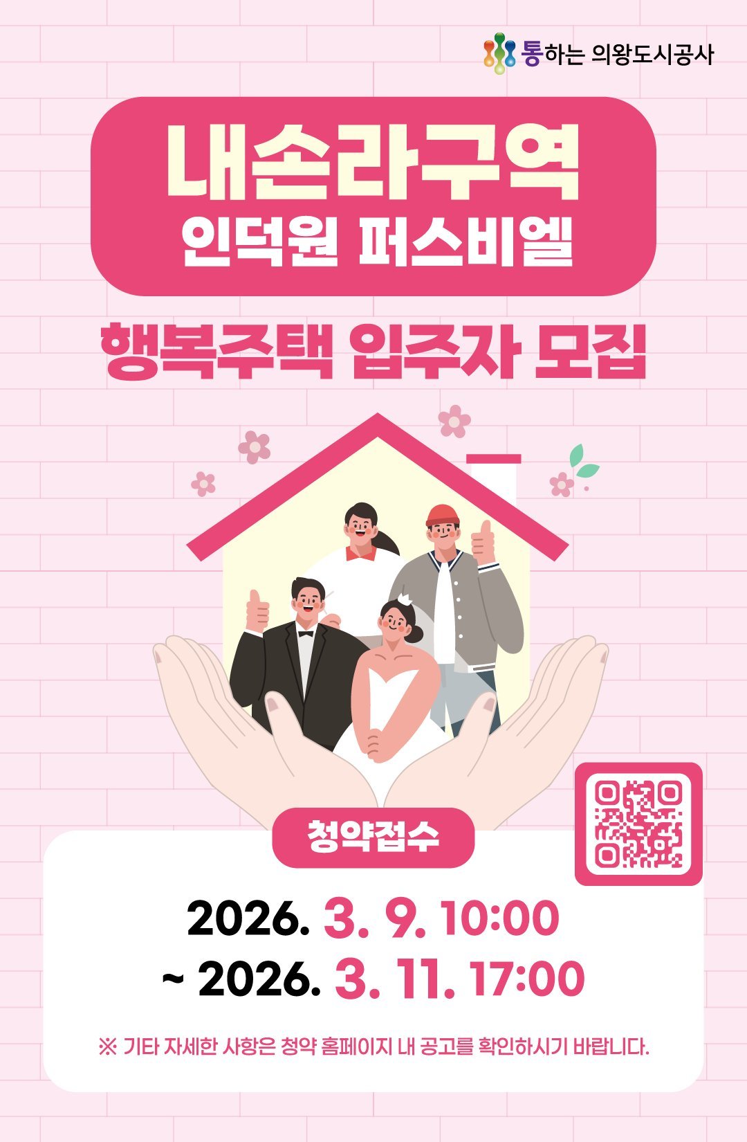 청약 신청은 의왕도시공사 청약홈페이지를 h 통해 온라인으로 진행되며 신청 기간은 2026년 3월 9일 오전 10시부터 3월 11일 오후 5시까지 3일간이다.
