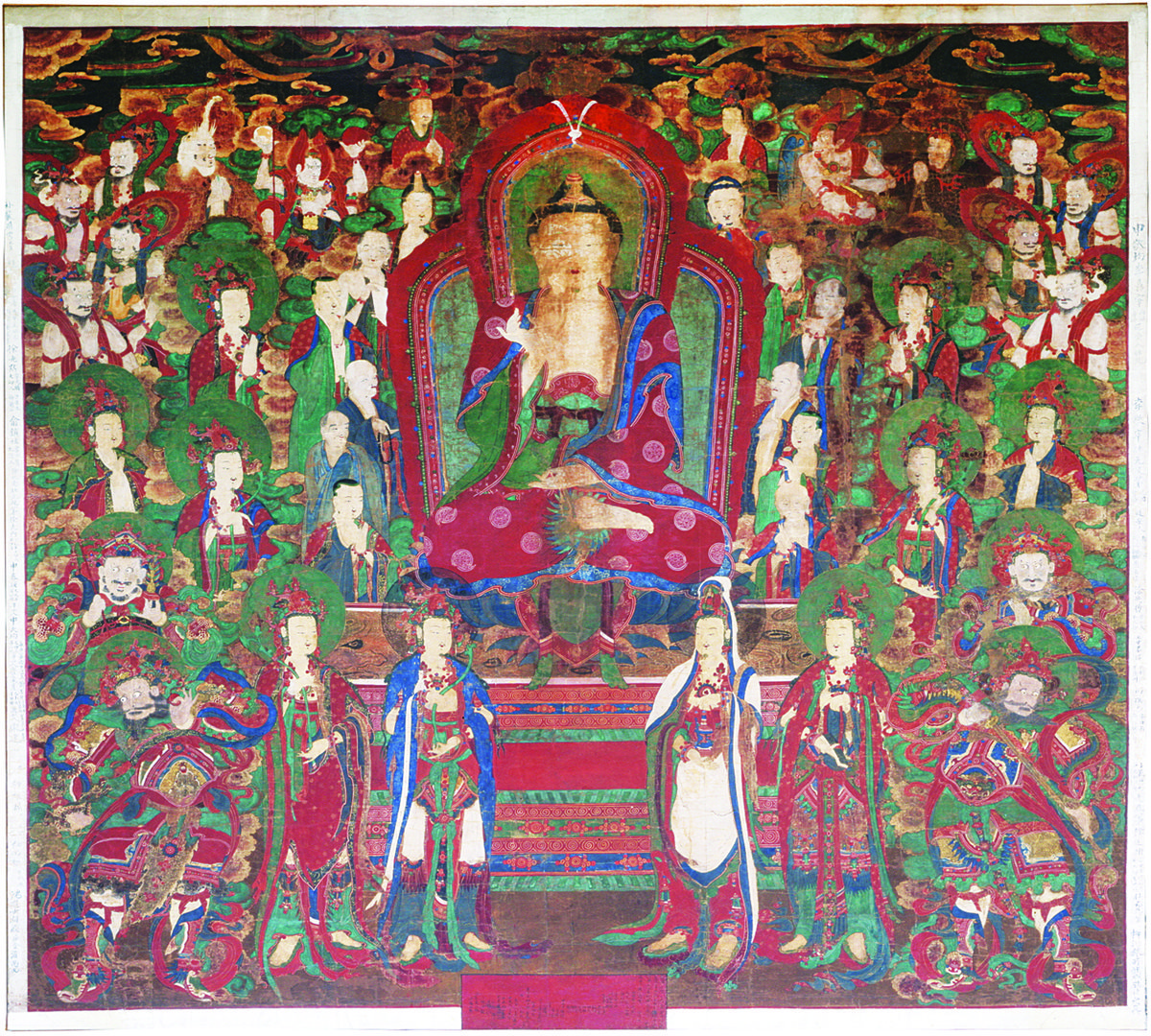 화면 구성은 아미타불이 중앙의 높은 대좌 위에 결가부좌하고 그 좌우에는 보살, 사천왕, 십대제자, 성중들을 배치했다.