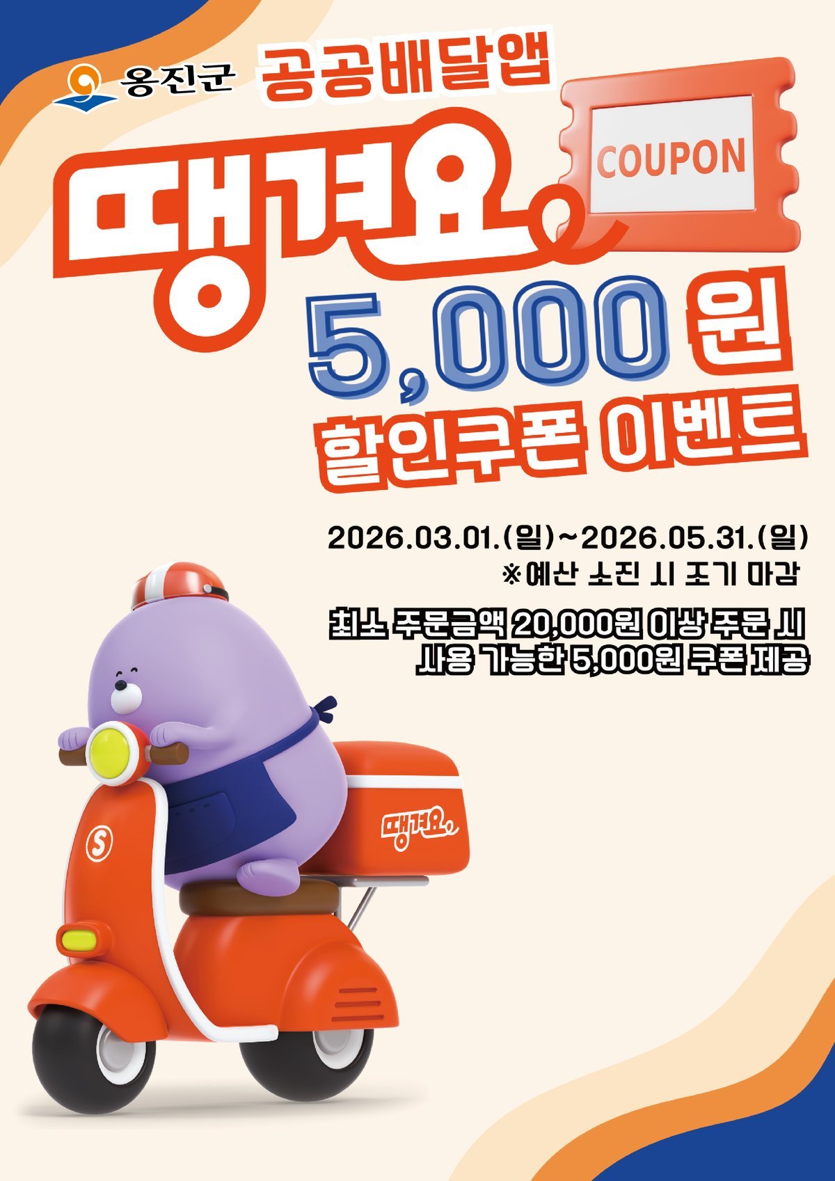 [금요저널] 옹진군은 지역 소상공인의 매출 증대와 군민의 생활비 부담 완화를 위해 공공배달앱 땡겨요 할인쿠폰 이벤트를 시행한다고 밝혔다.