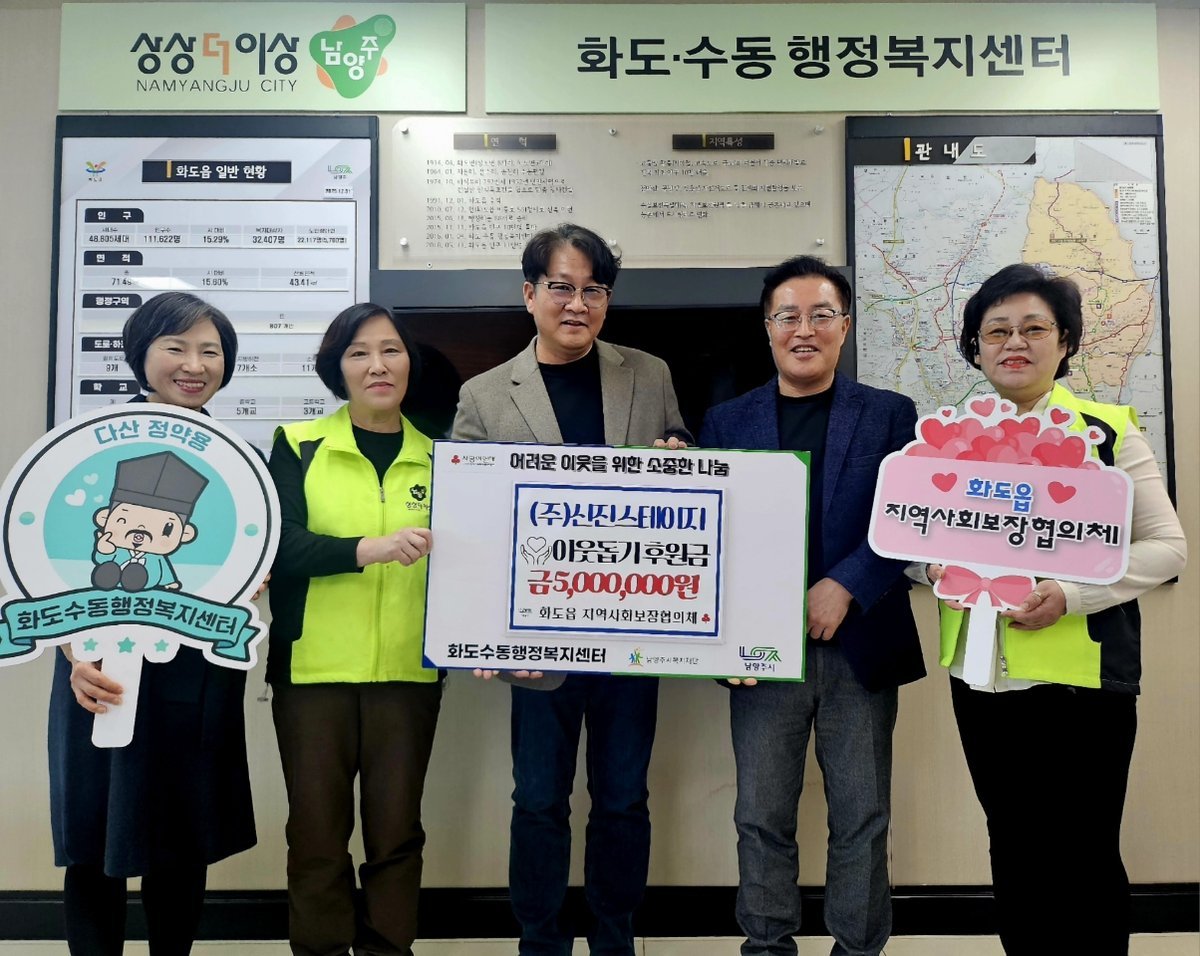[금요저널] 남양주시는 4일 관내 소재 기업 신진스테이지가 취약계층 지원을 위한 후원금 500만원을 화도읍 지역사회보장협의체에 기탁했다고 밝혔다.