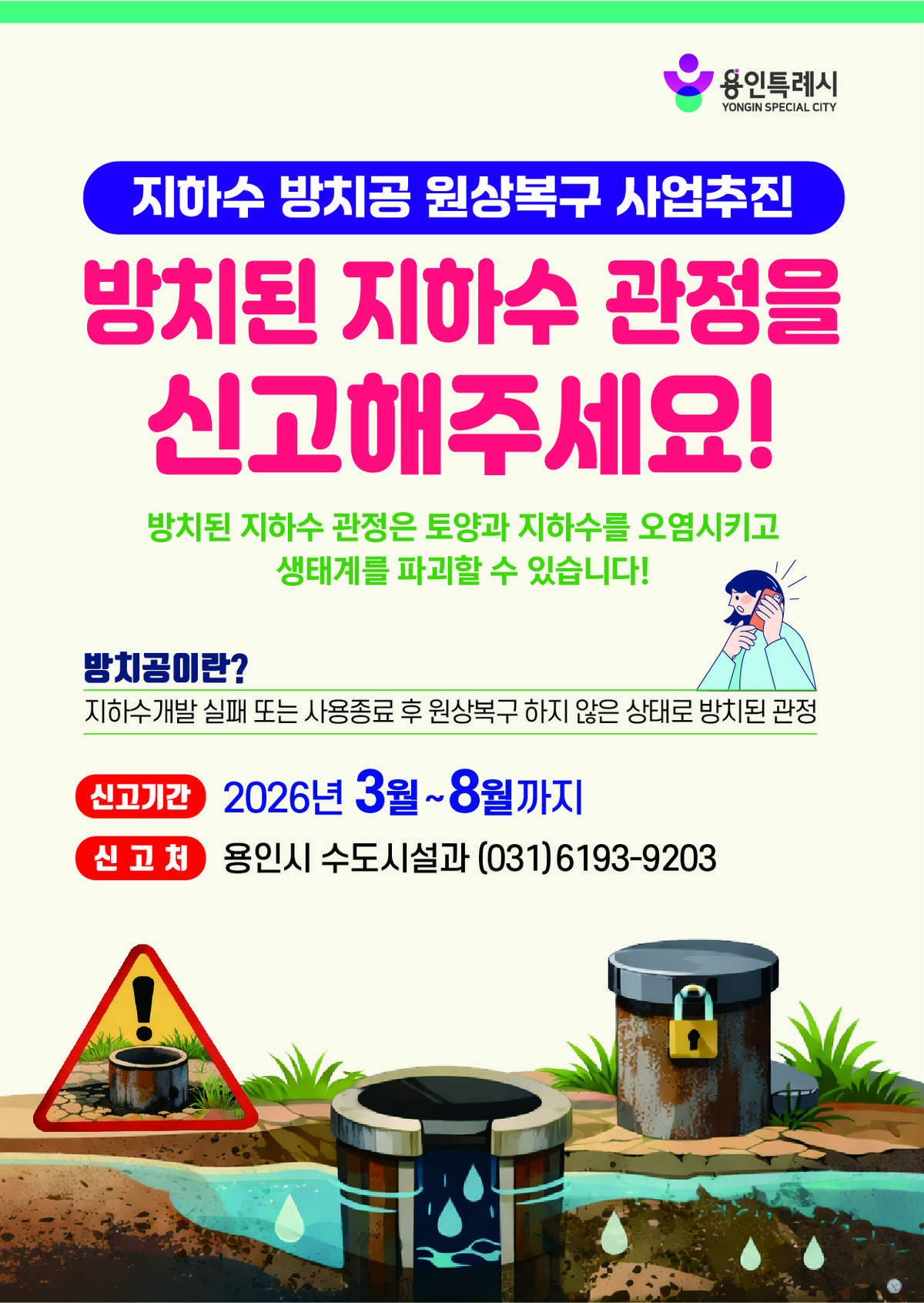 [금요저널] 용인특례시는 장기간 방치된 관정으로 인한 지하수 오염을 예방하기 위해 ‘지하수 방치공 원상복구 지원사업’을 추진한다고 5일 밝혔다.
