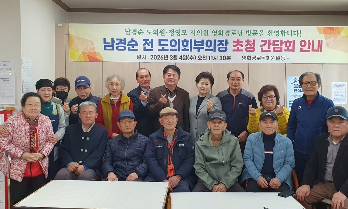 [금요저널] 수원특례시의회 보건복지위원회 정영모 의원은 2026년 3월 4일 영화경로당에서 남경순 전 경기도의회 부의장을 초청해 간담회를 개최하고 어르신들과 함께 지역 현안 및 경로당 이용 환경에 대한 의견을 청취했다.