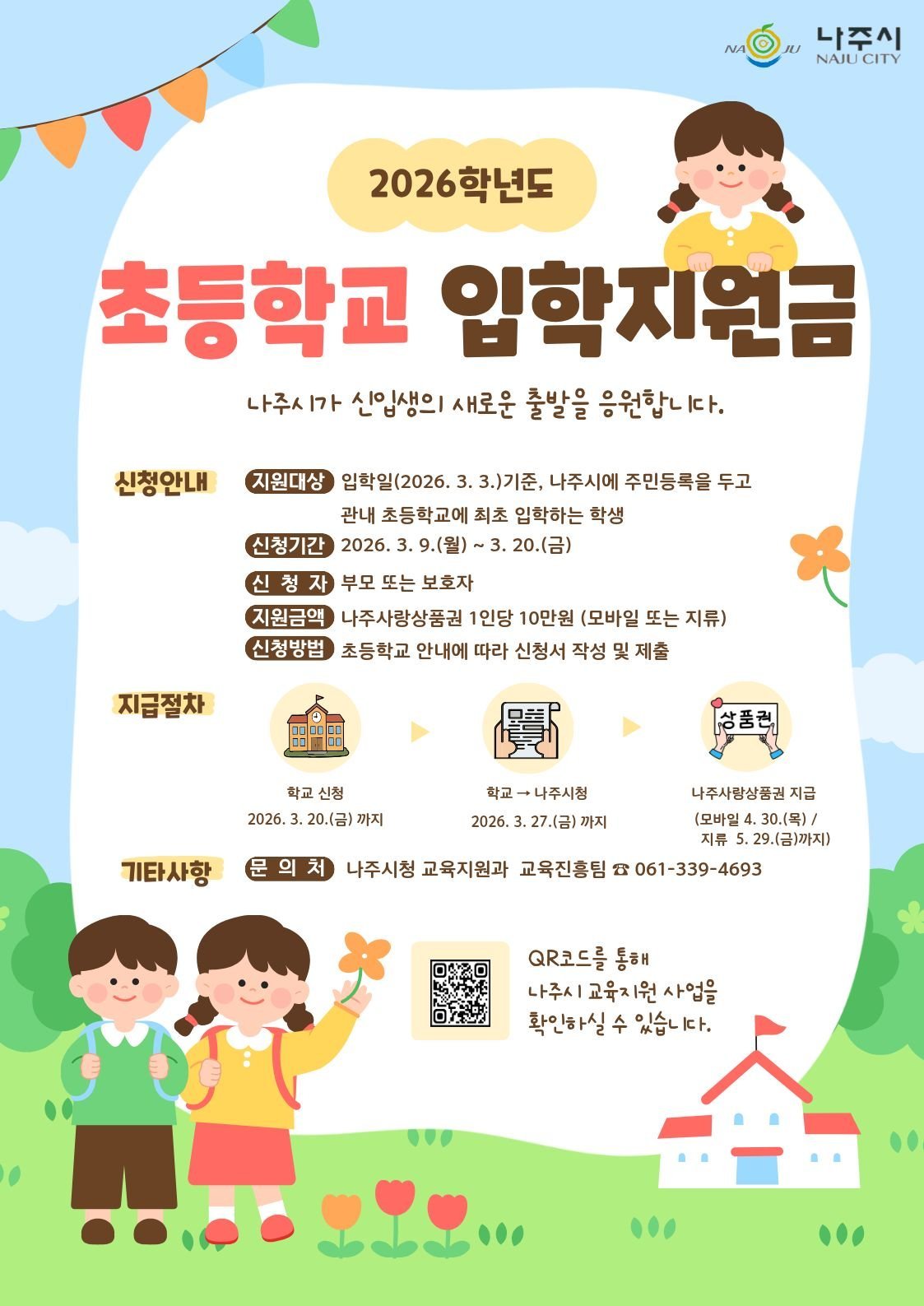 나주시는 2026년 초등학교 입학일인 3월 3일 기준 나주시에 주민등록을 두고 계속 거주하면서 관내 초등학교에 최초 입학하는 신입생을 대상으로 입학지원금을 지원한다고 5일 밝혔다.