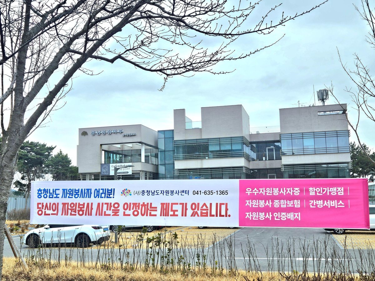 현수막에는 "당신의 자원봉사 시간을 인정하는 제도가 있다"라는 문구와 함께 우수자원봉사자증 할인가맹점 자원봉사 종합보험 간병서비스 자원봉사 인증배지 등 충청남도가 운영 중인 주요 인정 지원 제도가 소개되어 있다.