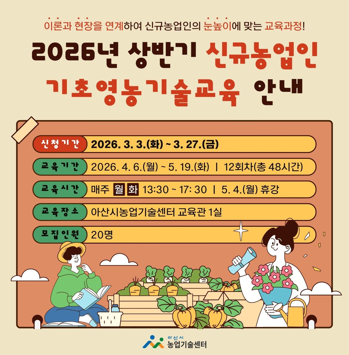 교육은 2026년 4월 6일부터 5월 19일까지 매주 월 화요일 총 12회, 48시간 과정으로 아산시농업기술센터 교육관과 농업 현장에서 진행된다.