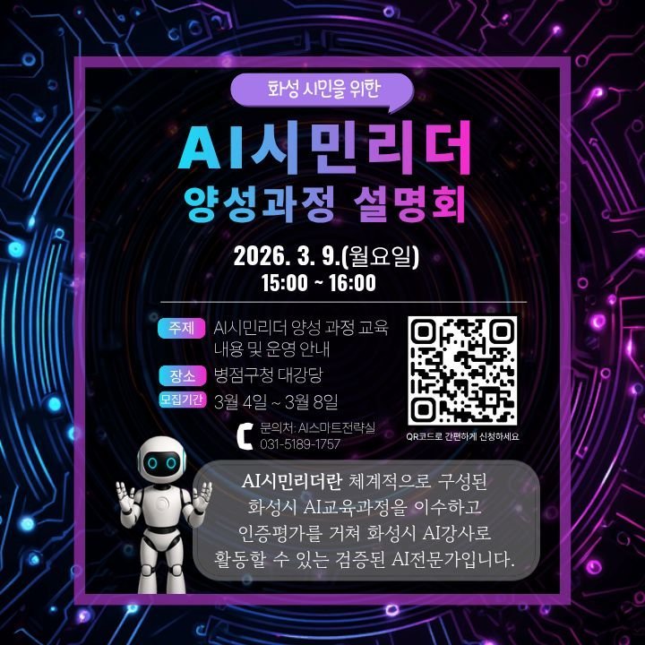 [금요저널] 화성특례시는 시민이 학습하고 교육하는 인공지능 학습 체계 구축을 위해 ‘2026년 AI시민리더 양성 교육’설명회를 3월 9일 오후 3시에 병점구청 대강당에서 개최한다.