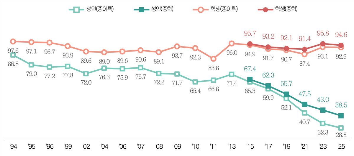 성인 전반의 경우, 연간 종합독서율은 38.5%, 종합독서량은 2.4권으로, 2023년 조사와 비교하면 종합독서율은 4.5%포인트, 독서량은 1.5권 감소했다. 학생의 종합독서율은 94.6%로, 2023년 조사 대비 1.2%포인트 감소했으나, 여전히 높은 수준을 유지하고 있다.