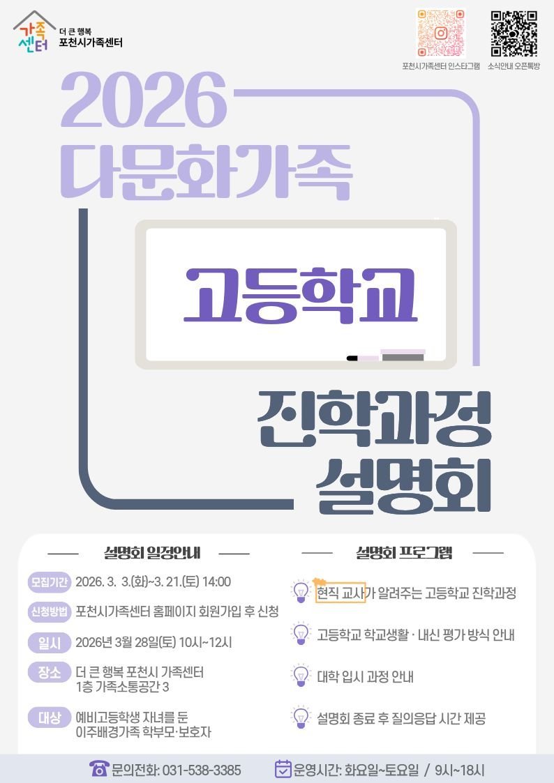 [금요저널] 포천시 직영 더 큰 행복 포천시가족센터가 오는 28일, 「2026 다문화가족 고등학교 진학과정 설명회」를 개최한다.