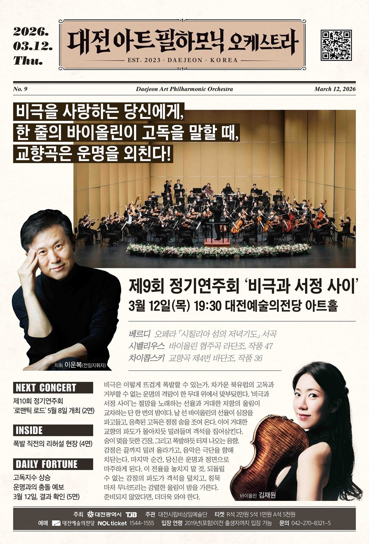 [금요저널] 대전아트필하모닉오케스트라는 3월 12일 19시 30분, 대전예술의전당 아트홀에서 제9회 정기연주회 ‘비극과 서정 사이’를 개최한다.