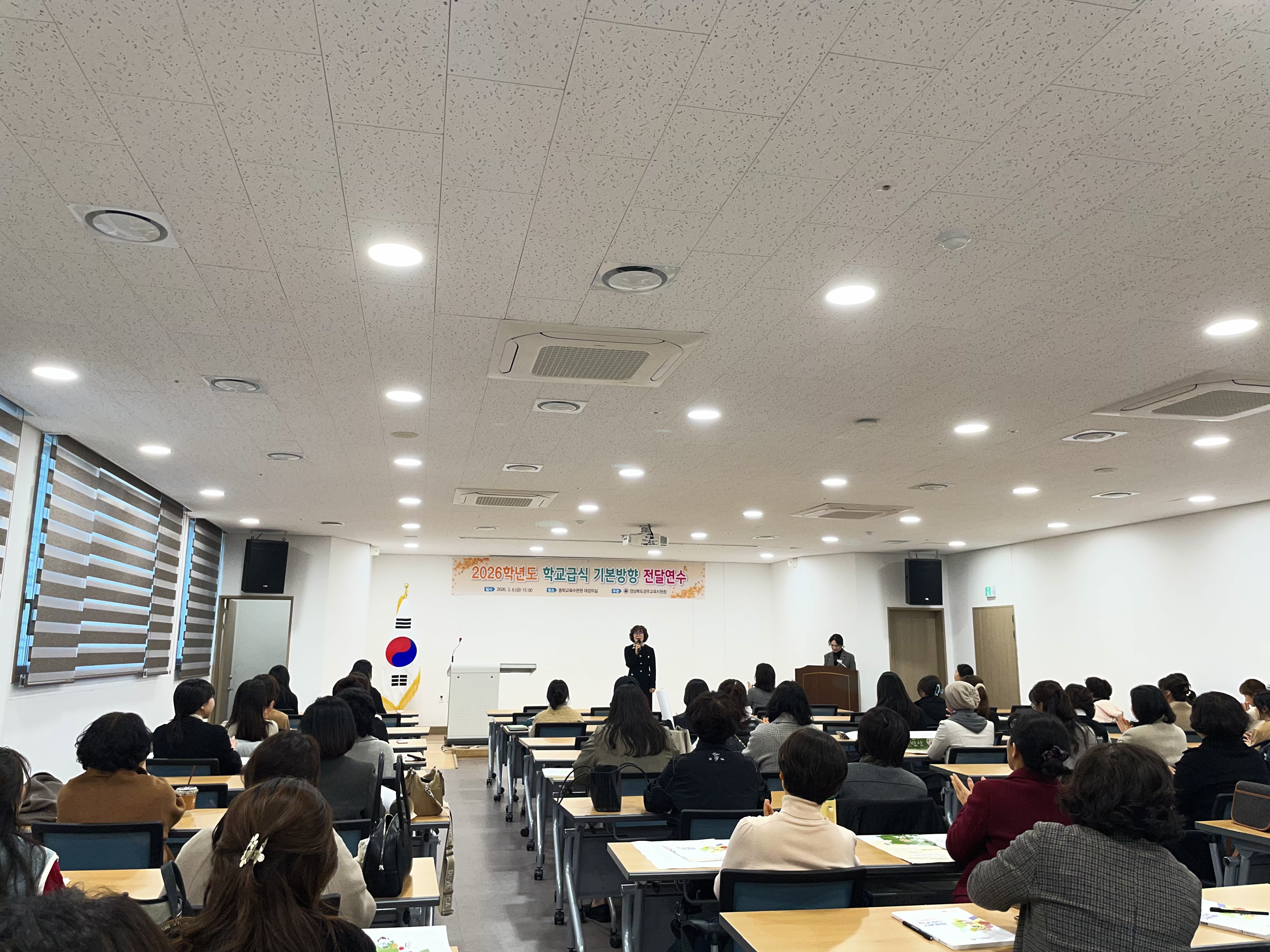 경주교육지원청(교육장 황영애)은 2026년 3월 6일(금) 동학교육수련원 대강의실에서 경주 관내 공립단설유치원 및 공·사립 초·중·고·특수학교 영양교사 및 영양사를 대상으로 ‘2026학년도 학교급식 기본방향 전달회의’를 개최했다.
