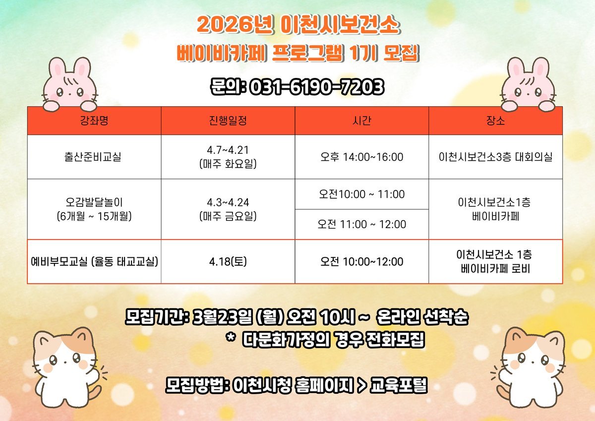 [금요저널] 이천시는 임산부 및 영유아 보호자를 대상으로 3월 23일 오전 10시부터 ‘2026년 베이비카페 프로그램 1기’참여자를 온라인 선착순으로 모집한다고 밝혔다.