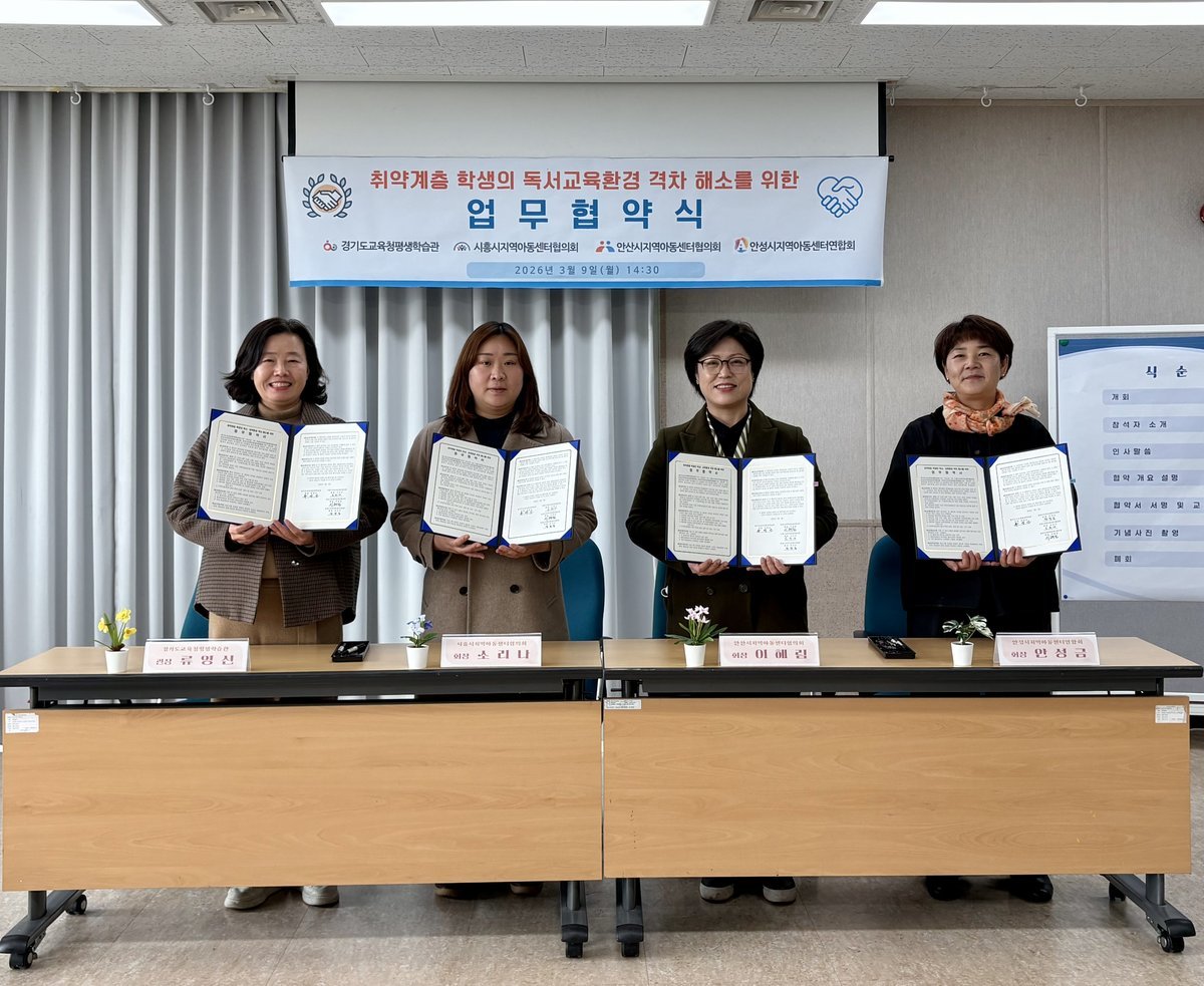 9일 경기도교육청평생학습관에서 열린 협약식에는 류영신 평생학습관장과 시흥 안산 안성지역아동센터협의회 회장 등 주요 관계자들이 참석해 취약계층 학생들의 독서 기반 교육환경을 개선하고 지역 간 교육 격차를 해소하는 데 힘을 모으기로 약속했다.