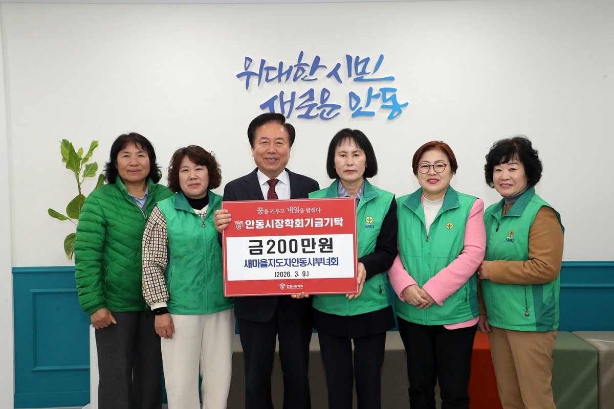 [금요저널] 새마을지도자안동시부녀회는 3월 9일 안동시청 시장실을 방문해 지역인재 육성을 위해 설립 운영되고 있는 안동시장학회에 장학기금 200만원을 전달했다.