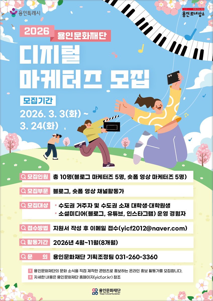 [금요저널] 용인문화재단은 오는 3월 24일까지 재단의 다양한 문화 예술사업을 시민의 시선으로 홍보하기 위한 '2026 용인문화재단 디지털 마케터즈'를 모집한다고 밝혔다.