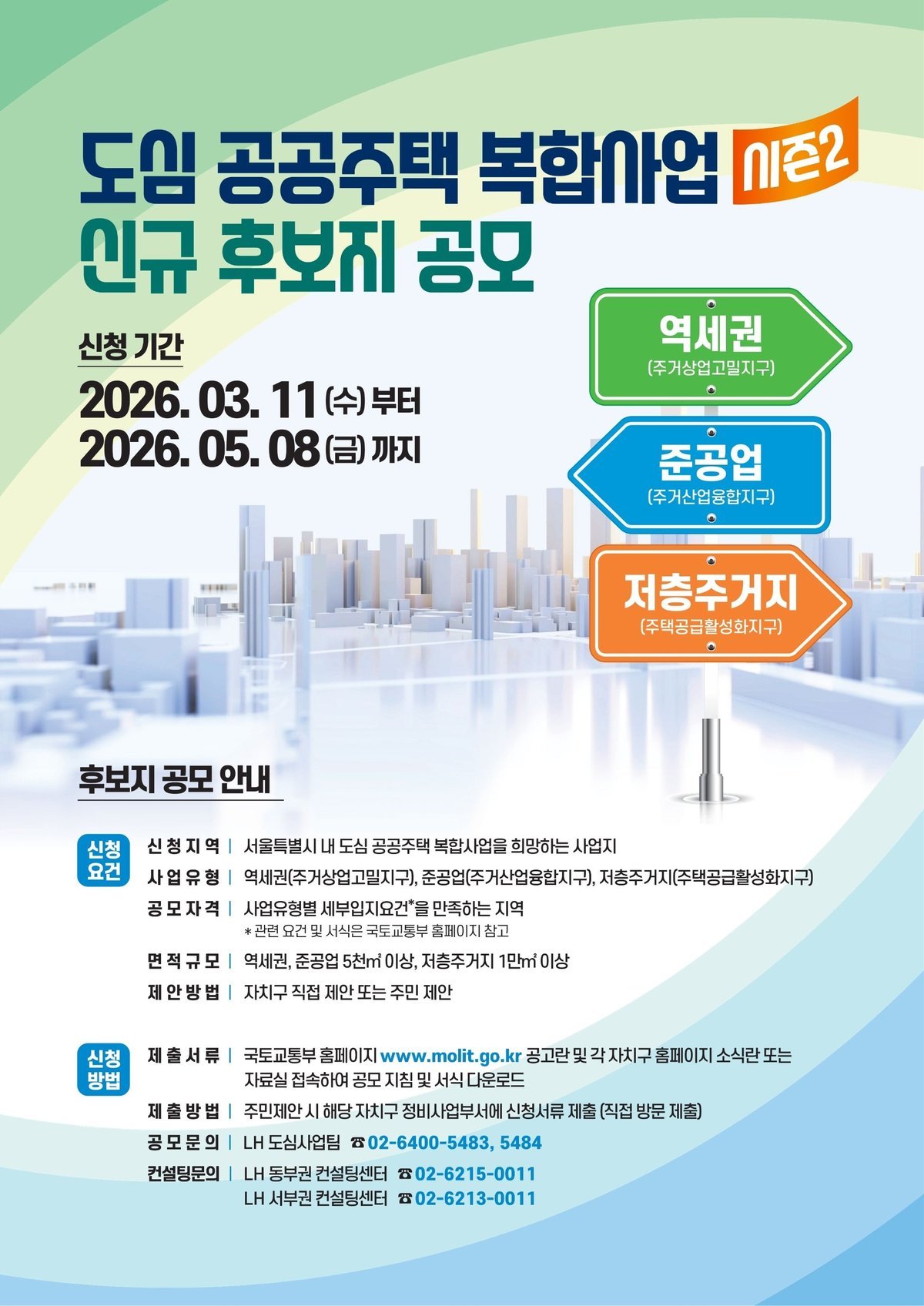 국토교통부는 도심 내 추가 주택 공급을 위해 도심 공공주택 복합사업 신규 후보지 공모를 3월 11일부터 실시한다. 공모 대상지는 서울이며 그 외 지역은 하반기에 추가로 공모할 예정이다.