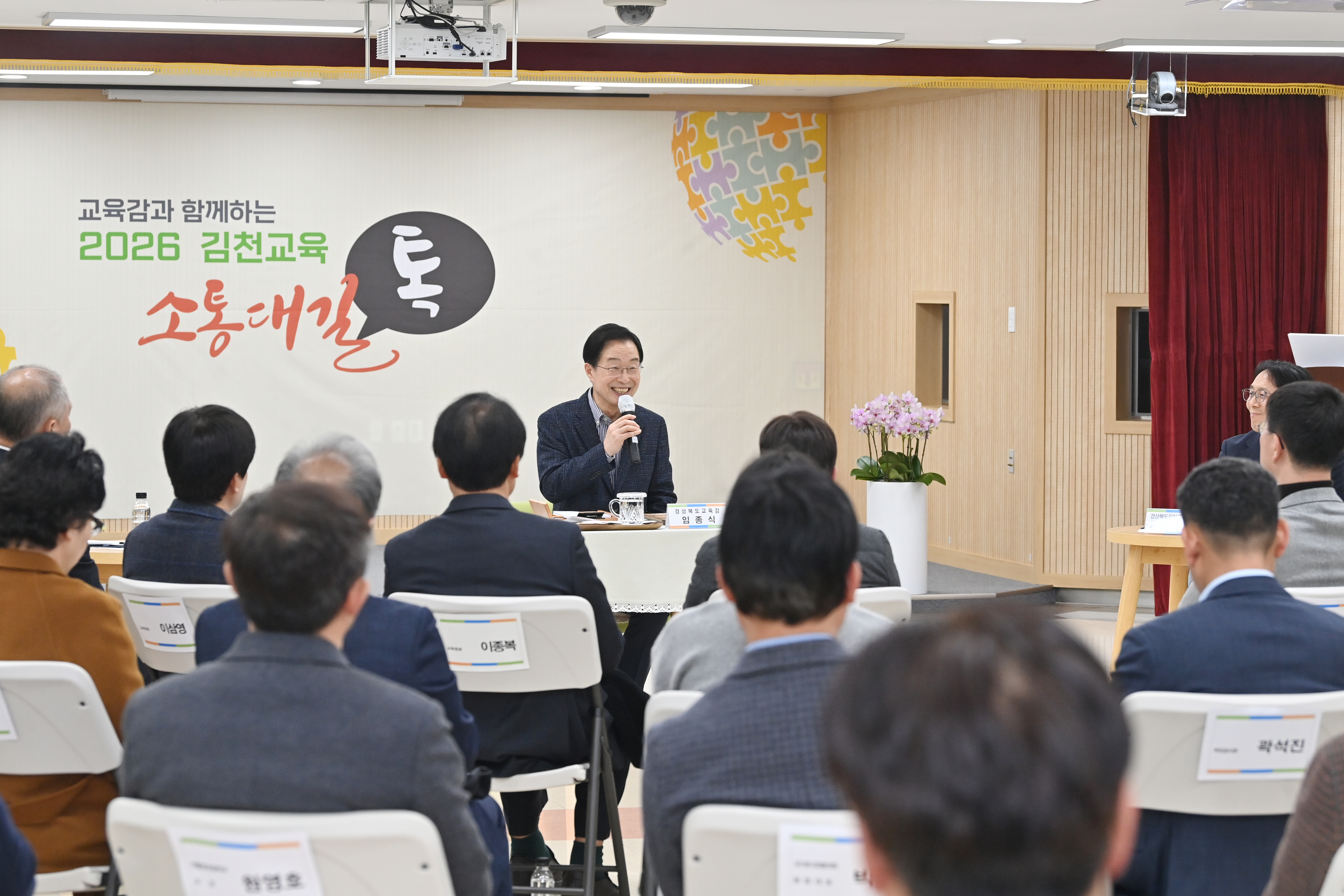 ▣ 경상북도김천교육지원청(교육장 모태화)은 3월 9일(월) 대회의실에서 관내 각급 학교장 대표단, 학교운영위원장협의회장, 학부모회협의회장, 녹색어머니회장, 학부모자원봉사자회장, 주민감사관, 민원제도개선협의회장, 공약이행평가단, 주민참여예산위원, 교육계 원로 등 교육가족 30여 명을 초청하여 ‘2026 교육감과 함께하는 김천교육 소통대길 톡’을 개최하였다.
