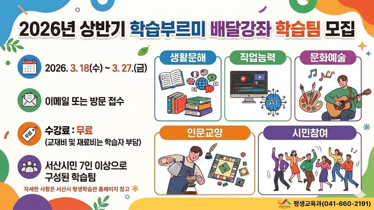 [금요저널] 충남 서산시는 오는 3월 18일부터 27일까지 ‘2026년 상반기 학습부르미 배달강좌’에 참여할 학습팀을 모집한다고 밝혔다.
