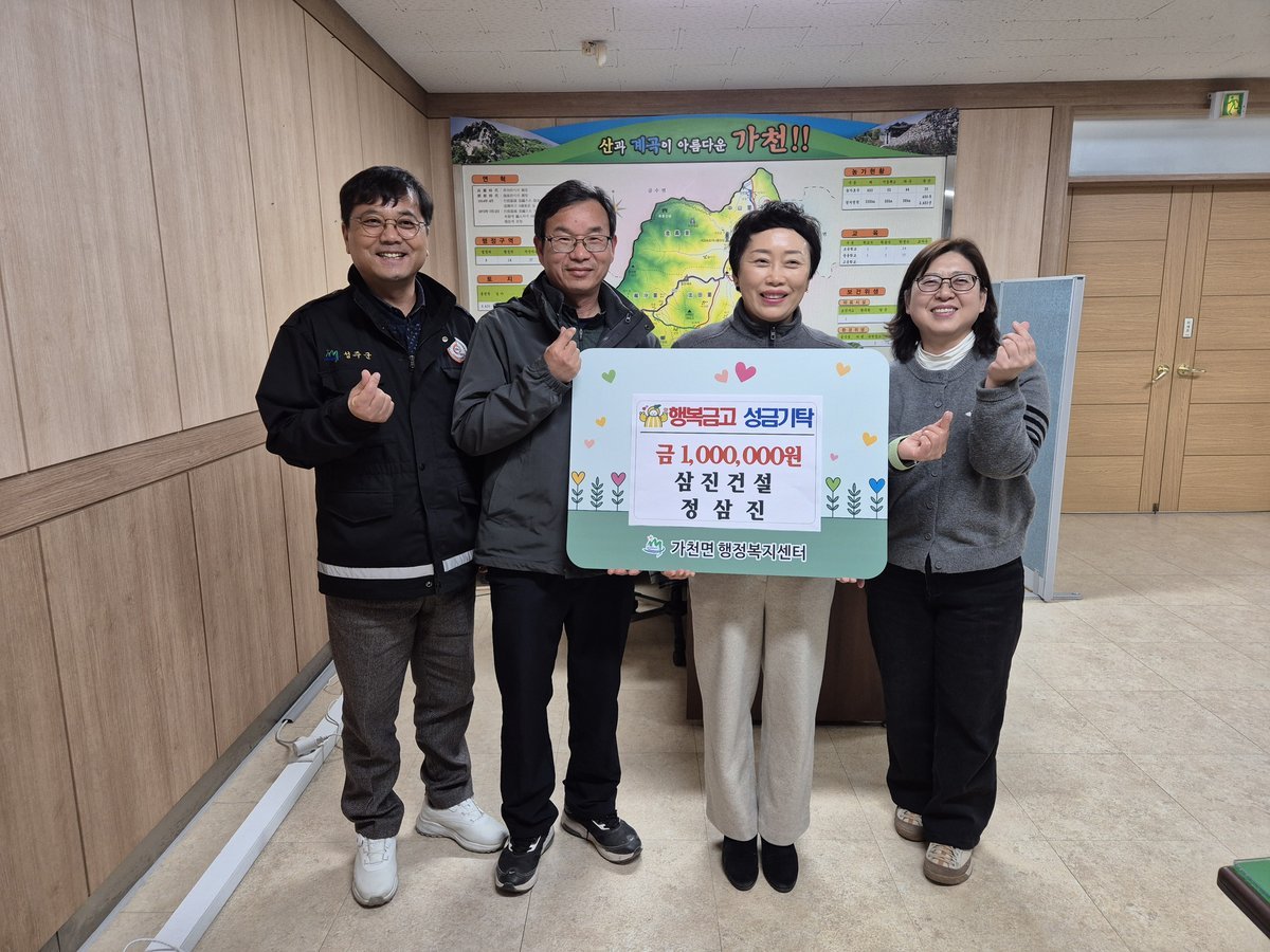 [금요저널] 3월 11일 삼진건설 정삼진 대표는 가천면행정복지센터를 방문해 성주군 지역사회보장협의체와 사회복지공동모금회의 연합모금사업인 '함께모아 행복금고'에 100만원을 기탁했다.