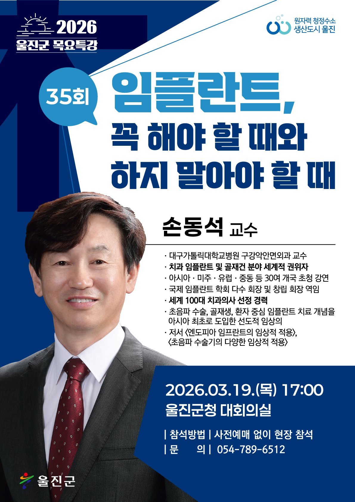 [금요저널] 울진군은 오는 3월 19일 오후 5시 울진군청 대회의실에서 손동석 교수를 초청해‘임플란트, 꼭 해야 할 때와 하지 말아야 할 때’를 주제로 제35회이자 2026년 첫 목요특강을 개최한다.