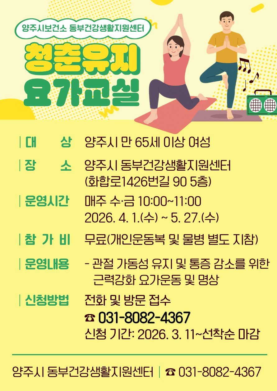 [금요저널] 양주시보건소 동부건강생활지원센터가 중 장년층의 관절염 및 낙상 예방을 위한 맞춤형 요가 프로그램인 '청춘유지 요가교실'1기 참여자를 모집한다.