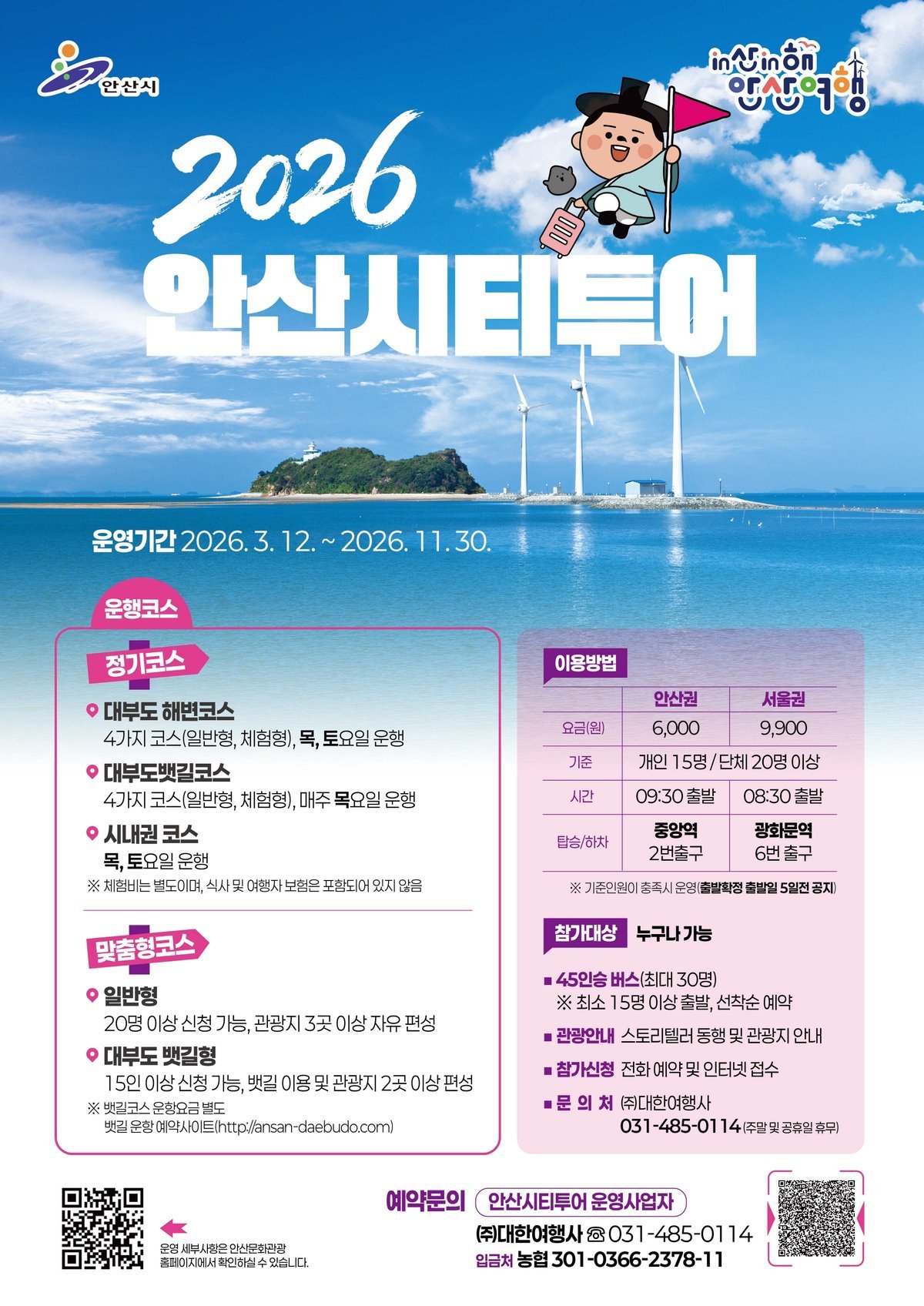 이민근 안산시장은 “2026 안산시티투어는 시화호 뱃길 개통과 함께 안산의 다양한 관광 자원을 연결하는 핵심 관광 콘텐츠가 될 것”이라며 “시민과 관광객 모두가 안산의 매력을 편안하게 즐길 수 있도록 관광 활성화에 힘쓰겠다”고 말했다.