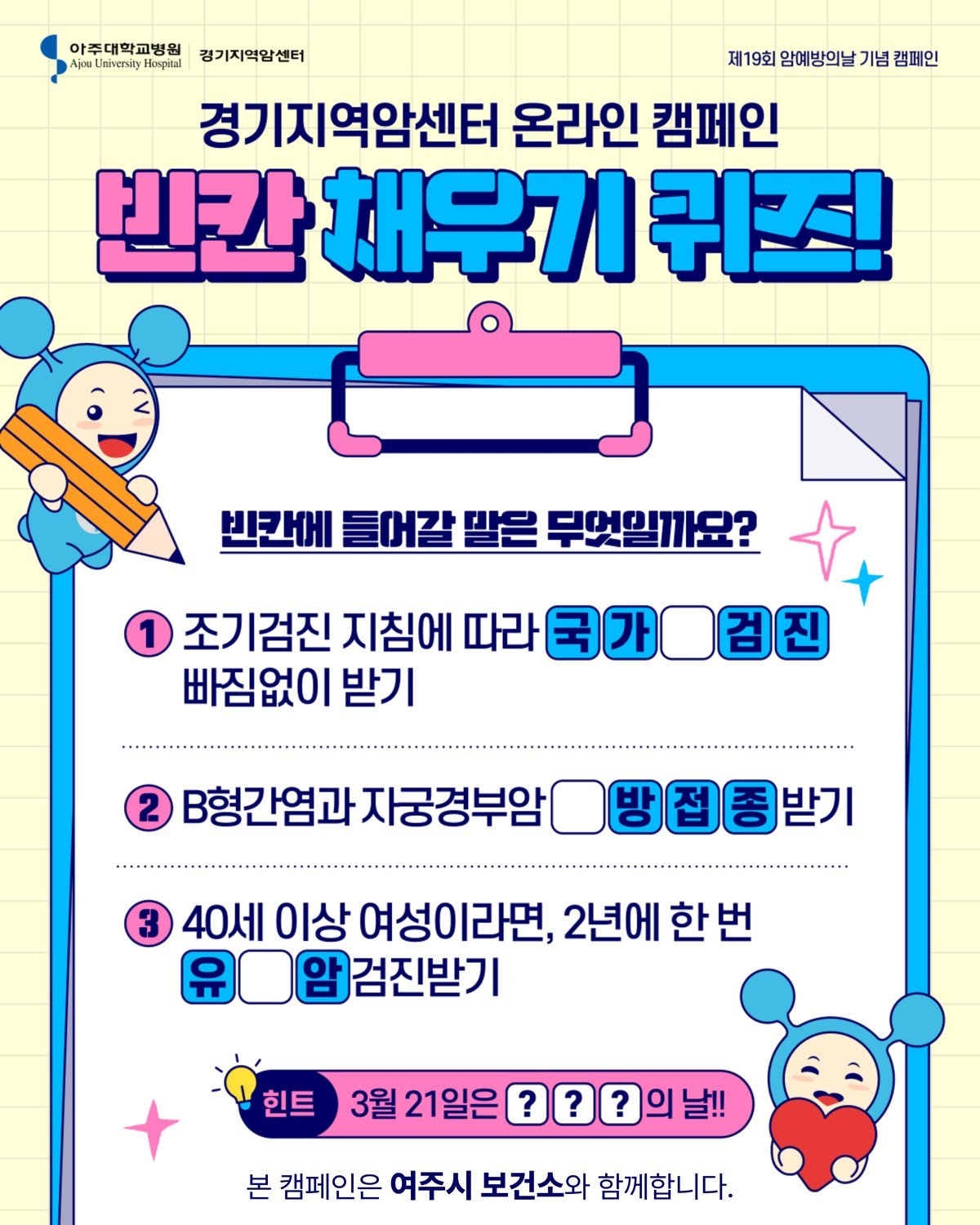 [금요저널] 여주시 보건소는 오는 3월 21일 '암 예방의 날'을 맞아 경기지역암센터와 함께 시민들의 암 예방 인식 향상과 건강한 생활습관 실천을 위한 온라인 캠페인을 진행한다.