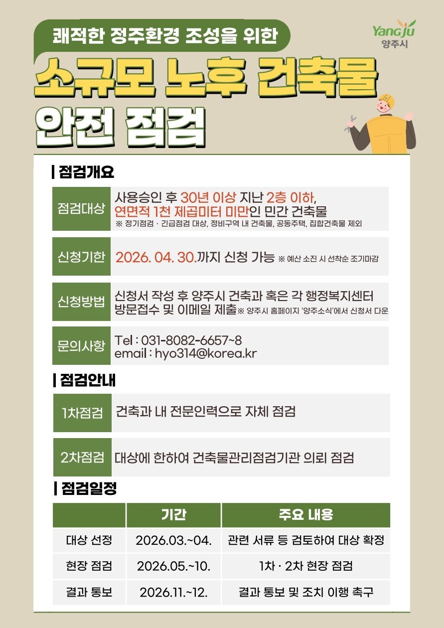 안전점검을 희망하는 건축물 소유자나 관리자는 오는 4월 30일까지 신청서를 작성해 양주시청 1층 건축과 또는 각 읍면동 행정복지센터에 방문 접수하거나 전자우편로 제출하면 된다.