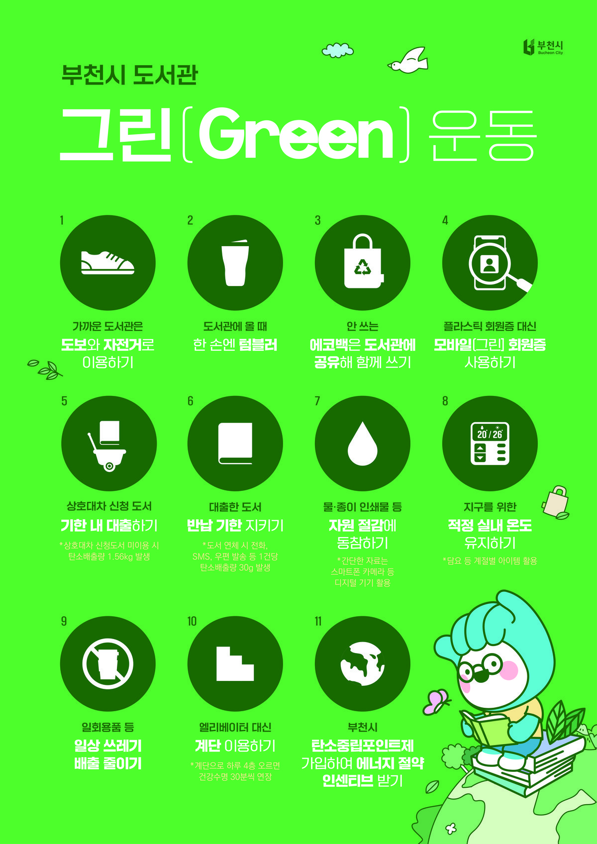 그린 실천 목록에는 가까운 도서관을 도보나 자전거로 이용하기, 도서관 방문 시 텀블러 사용하기, 사용하지 않는 에코백을 도서관에 기증하기 등 일상에서 쉽게 실천할 수 있는 친환경 활동이 포함된다.